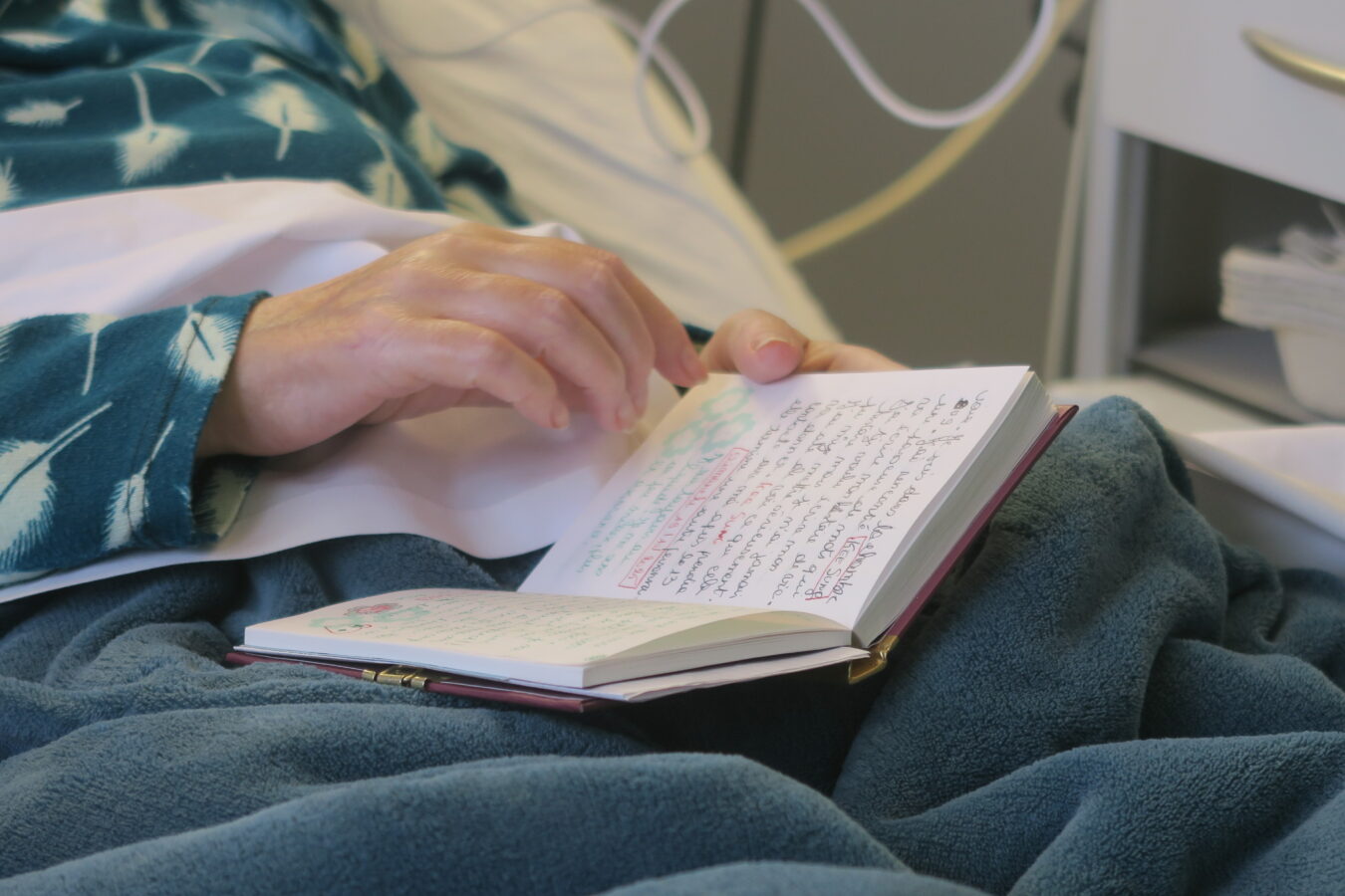 Femme de papier, C. avait d’ailleurs commencé à consigner à la main les épreuves de sa maladie dès son apparition en 2019, dans un petit carnet qu’elle conserve proche d’elle, dans son tiroir de chevet. « Je voulais écrire mes mémoires, mais au final, je ne l’ai jamais fait », se remémore-t-elle en feuilletant les pages pourtant remplies. À propos de son écriture droite et soignée, « je suis gauchère mais j’écris comme une droitière ». « Je vois que mon écriture a fort évolué, avec la maladie, ça devenait de plus en plus difficile d’écrire », raconte-t-elle, en refermant son carnet, dont la couverture est illustrée par le dessin d’un enfant.